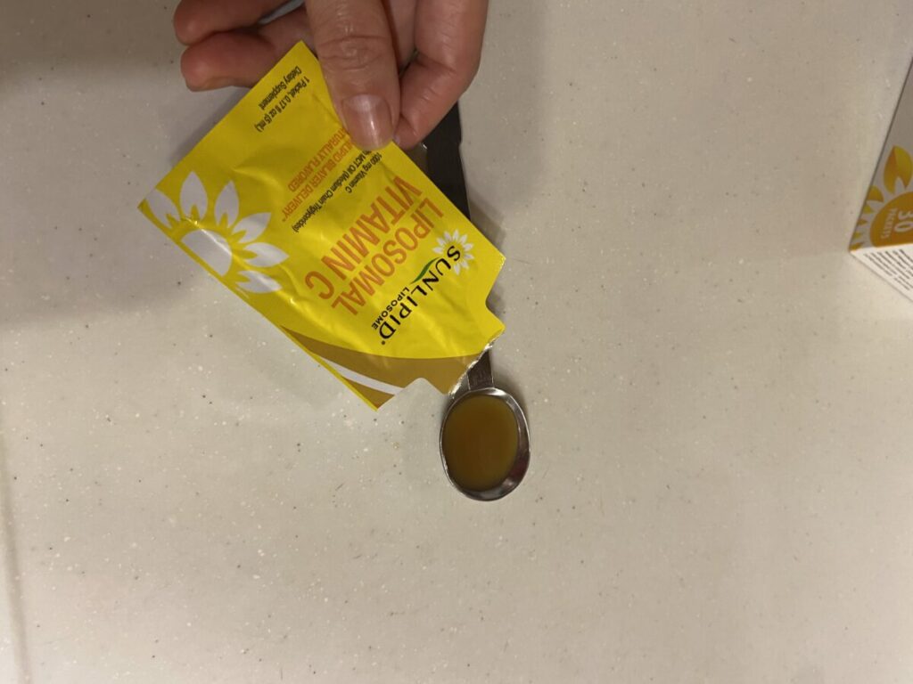 「SunLipid リポソームビタミンC+中鎖脂肪酸トリグリセリドオイル」です。私はiHerbで購入しました。iHerbは紹介コードを使うとちょっとお安くなります。購入するときになにも紹介コードもないときは私の紹介コードCOW8899をお使いください。